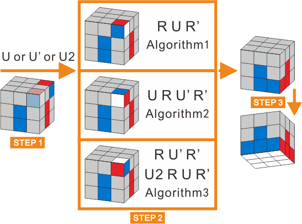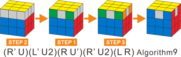 2)If none of the corners are placed correctly, execute Algorithm 9 once, and look for a pair of the corner, then execute algorithm 9 once again.